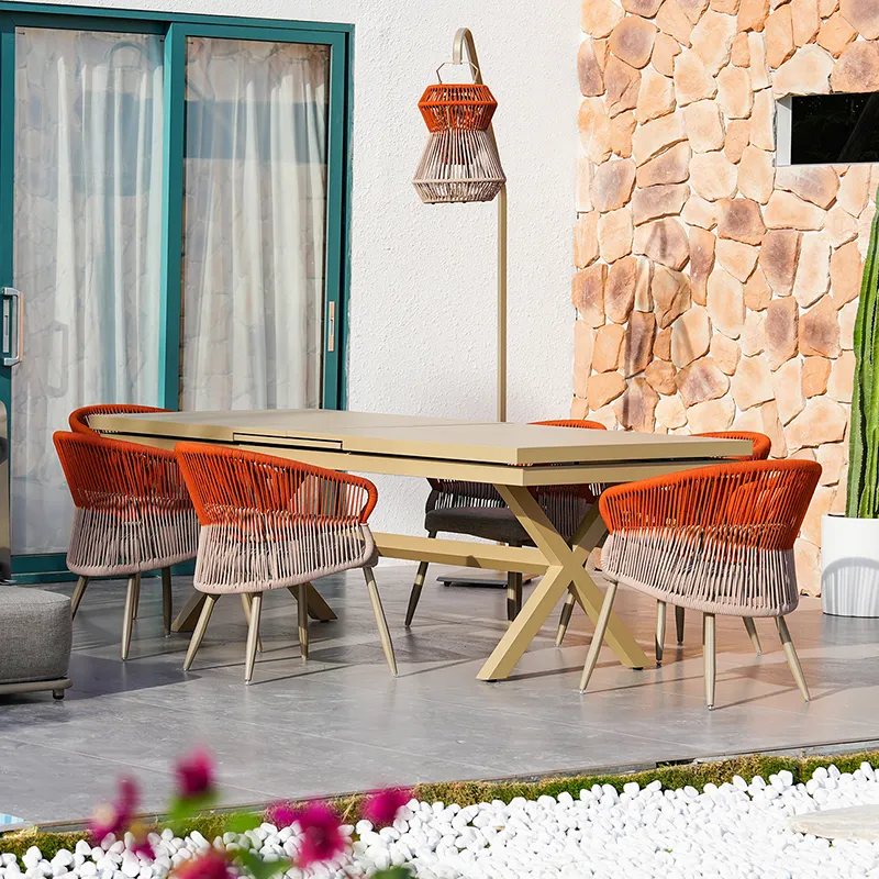 Have you grown tired of those outdoor sofas that are "lacking in uniqueness" (monotonous neutral colors), "easily damaged in bad weather" (weakened woven texture), or "inharmonious with luxurious decorative styles" (cheap materials)? The VORTEX series of products can solve all these problems: The vortex weaving pattern adds an artistic touch; the champagne red tone enhances the elegant temperament; the all-aluminum material combined with PE ropes can resist sunlight and rain; the modular design is suitable for any space. Whether for furniture arrangement in a villa courtyard or a boutique hotel, this set of products can exude a sense of "luxury" without sacrificing durability - in the off-season, outdoor furniture does not need to be stored indoors (please refer to the video content "Video Management" for details on weaving details and weather tests).